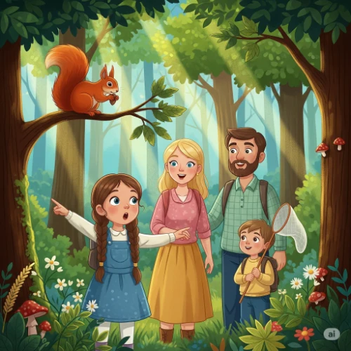 #1. Tijdens een boswandeling met haar familie ziet Tess plotseling een prachtige rode eekhoorn met een grote pluizige staart.