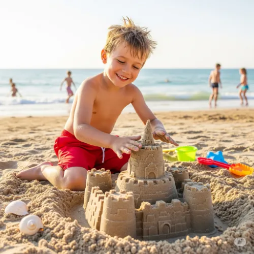 Tom is op het strand. Hij bouwt een zandkasteel en lacht.Tom is waarschijnlijk blij.