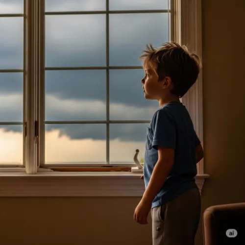 Zoë is op school. Ze kijkt naar buiten en ziet donkere wolken.Het gaat waarschijnlijk regenen.