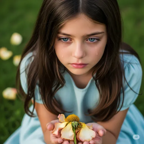 Mila is in het park. Ze kijkt kijkt naar een kapotte bloem en zucht.Mila is waarschijnlijk blij.
