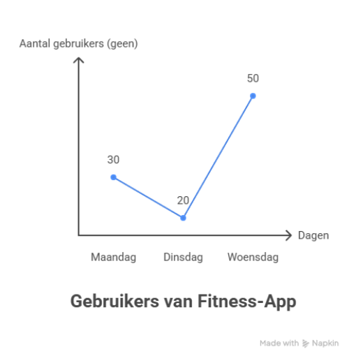 #5. Een lijngrafiek toont gebruikers van een fitness-app: Maandag: 30, Dinsdag: 20, Woensdag: 50, totaal 100. Hoeveel procent gebruikt de app op maandag??