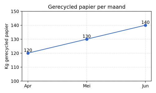 #9. Stijgt of daalt het aantal kg papier gerecycled van april naar juni? (Tabel: Apr: 120; Mei: 130; Jun: 140)