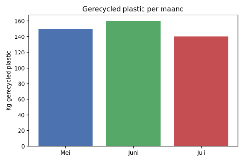 #5. Is het aantal kg plastic gerecycled gestegen of gedaald van mei naar juni? (Tabel: Mei: 150; Jun: 160; Jul: 140)