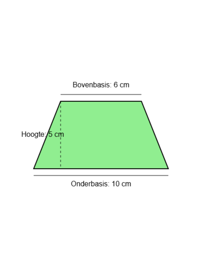 #9. Een trapezium heeft bovenbasis 6 cm, onderbasis 10 cm, en hoogte 5 cm. Wat is de oppervlakte?