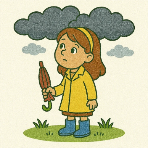 Sophie kijkt naar donkere wolken en pakt een paraplu.