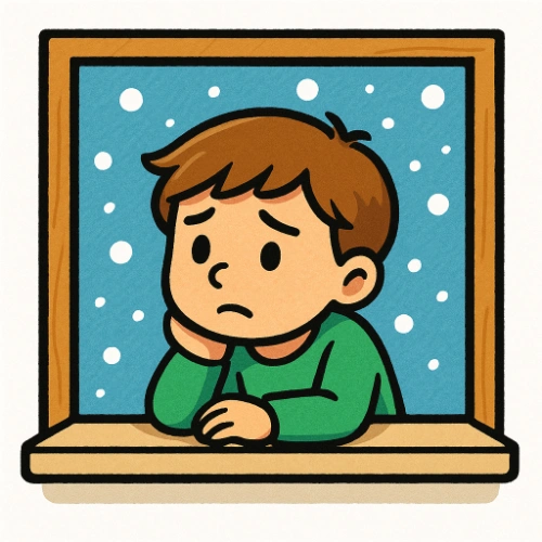 Tom ziet sneeuw vallen uit het raam.Tom wil sneeuwpoppen bouwen.