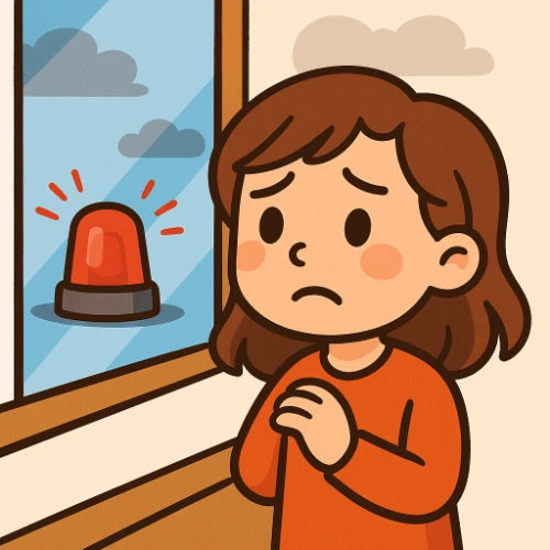 Luna hoort een sirene en kijkt bezorgd.Er is waarschijnlijk een brand.