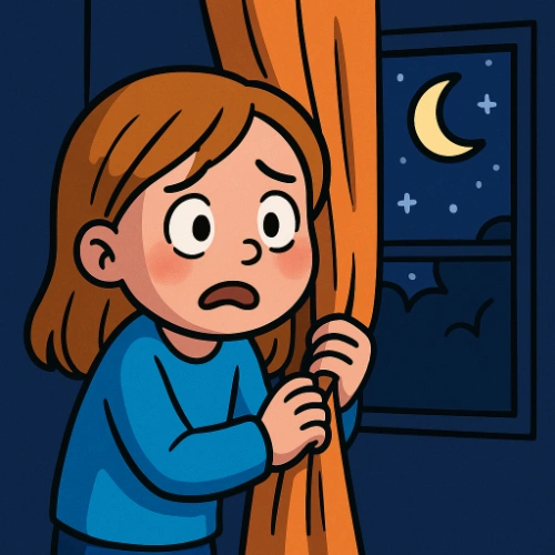 #1. Anna hoorde een geluid in het donker en verstopte zich achter de gordijnen. Haar hart klopte snel. Ze was bang.