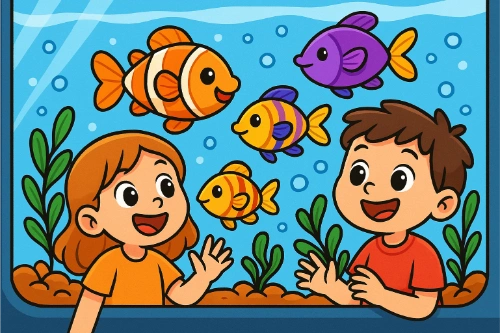 #2. In het aquarium zwommen vissen met felle kleuren. Ze dansten bijna in het water. De kinderen keken vol bewondering.